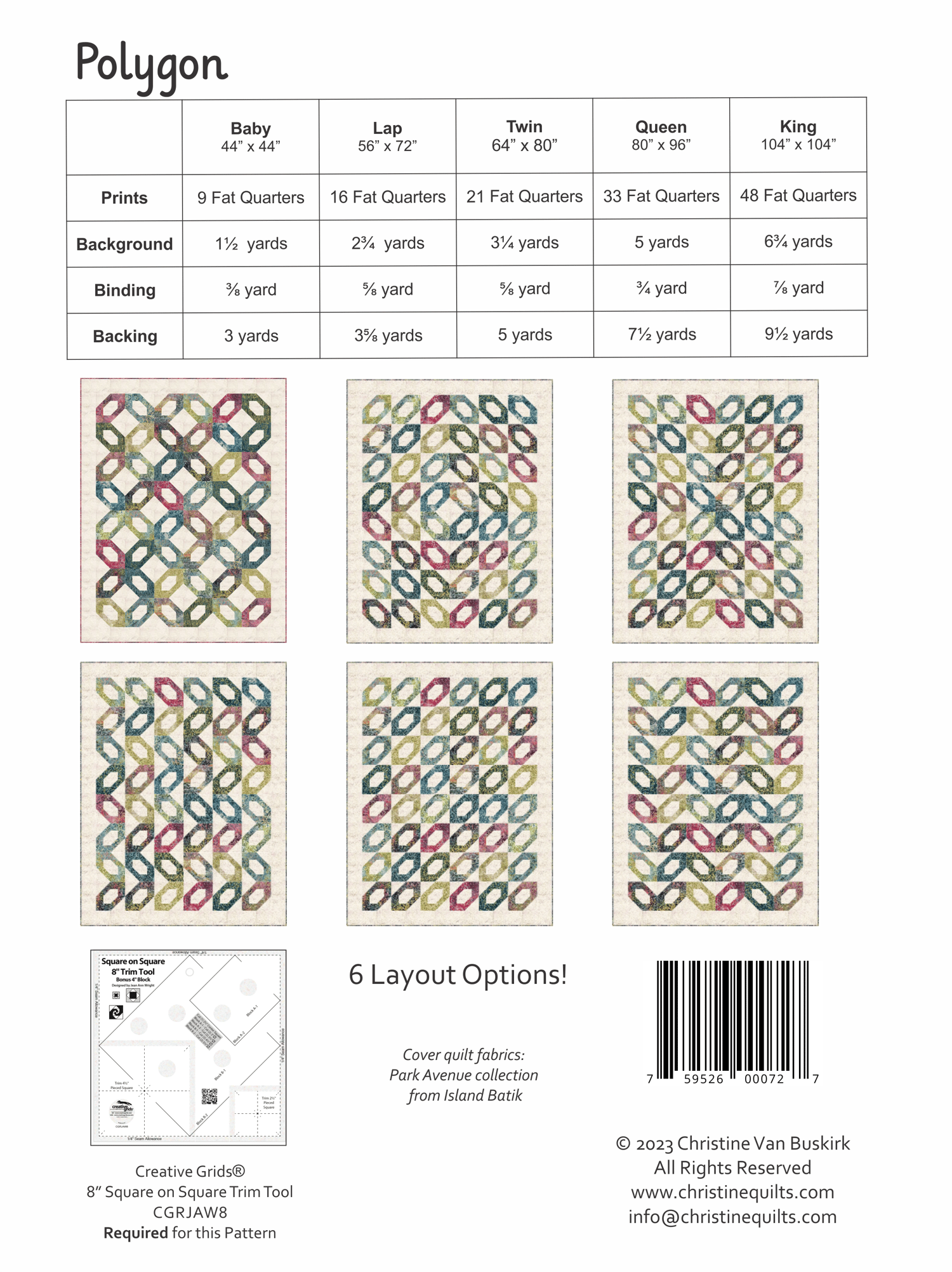 Polygon is the perfect pattern for Fat Quarters. Start with one simple block, choose one of the six included layouts, and you'll have a dynamic quilt in no time! Use of the (required) Creative Grids Square on Square 8" Trim Tool assures your blocks will be accurately sized, making quilt assembly a breeze. 5 sizes options, from Baby to King.